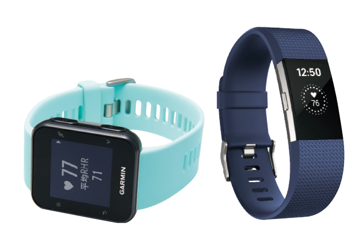 右「チャージ2」1万9800円/フィットビット(www.fitbit.com)、左「フォアアスリート 35J」2万4800円/いいよねっと(049-267-9114)心拍数を把握して効率的にトレーニング! 効果的な運動には心拍数がカギ。人気ブランドから光学式心拍計の搭載モデルが登場。