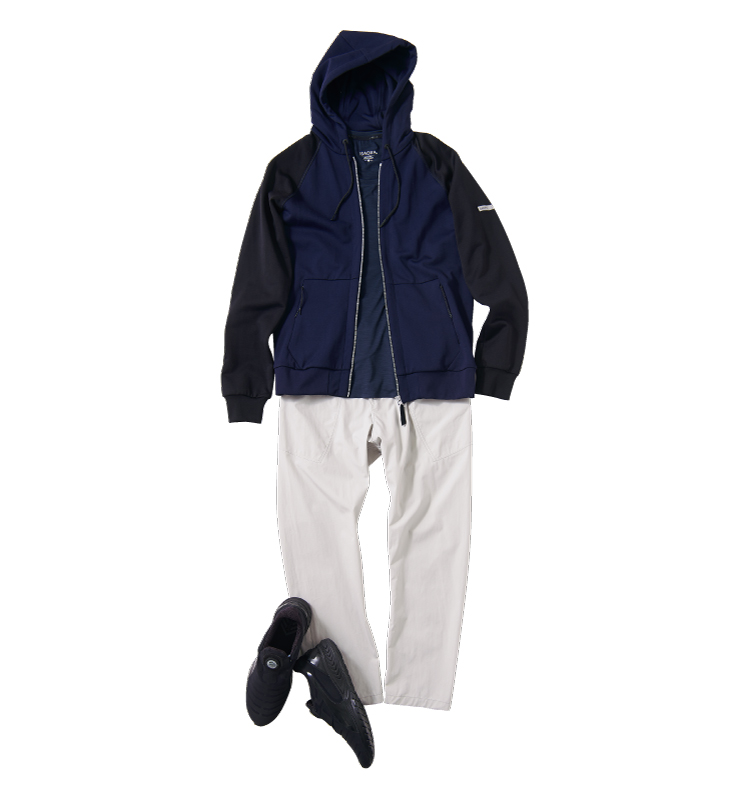 パーカ1万7120円、ノースリーブカットソー7180円、パンツ1万8222円[すべて参考価格]/すべてイサオラ(www.isaora.com)、シューズ1万4000円/プーマ(プーマ お客様サービス 0120-125-150)切り替えディテールや色遣いがハイセンス! NYを拠点に高機能とファッションを融合した服作りで人気を博すイサオラのトレーニングウェア。黒×紺の配色で袖と身頃を切り替えたパーカや、爽やかなホワイトパンツなど高感度なデザインがうれしい。