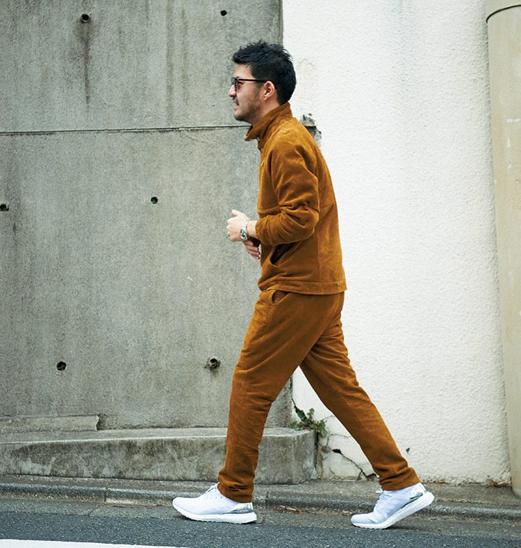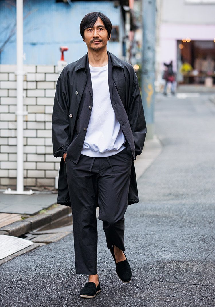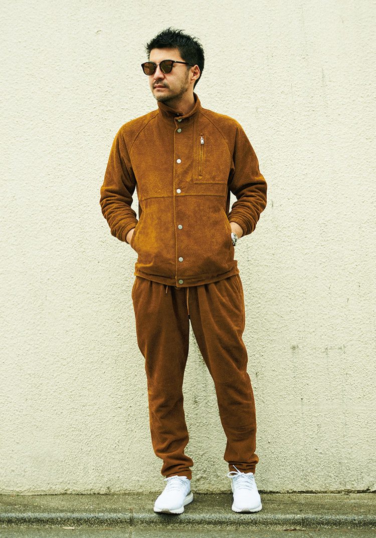 それでも、ユルすぎず清潔感を出すには2つのポイントがある。「まず、オフの日はほぼスウェットパンツですが、“パジャマ感”が出ないよう、尻が隠れる丈感のコートを羽織っています」。全身アースカラーで統一するのも、クリーンさを感じさせる手だ。「もうひとつ、きちんと感のあるセットアップはマスト。今好きなのはコート×ジャケット×パンツという“変則スリーピース”。ブラックで大人っぽいのにシャカシャカ素材で、ドローコード付きのパンツ。このユルさがツボです」。