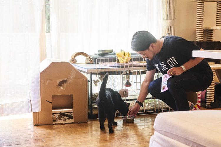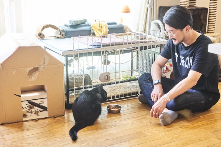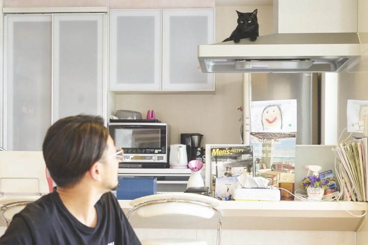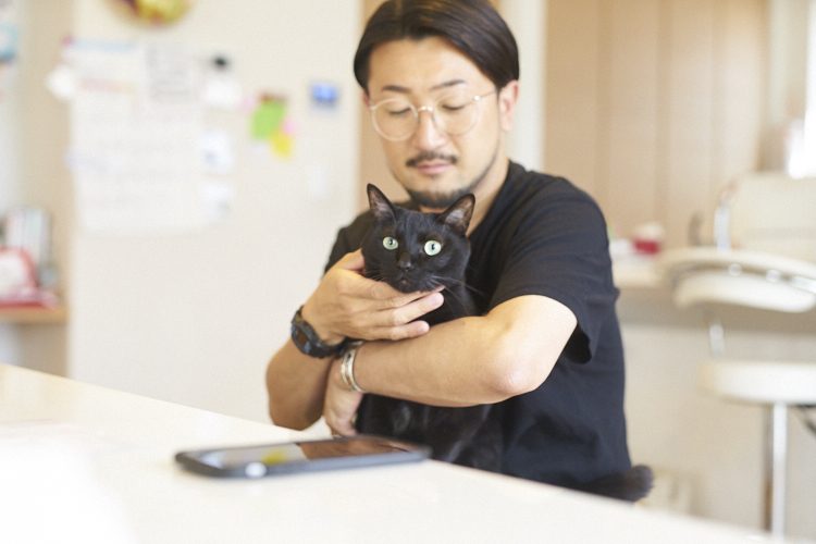 MEN’S GROOMING SALON AOYAMAのスタイリスト・長戸寛典。海は長戸に無関心で、甘えることはほとんどない。もちろん膝に乗ってくるなんてこともなく、常に適度な距離を置いている。