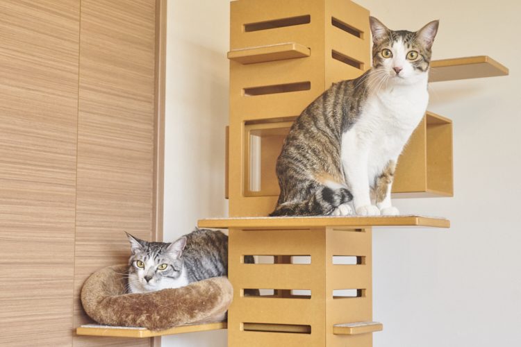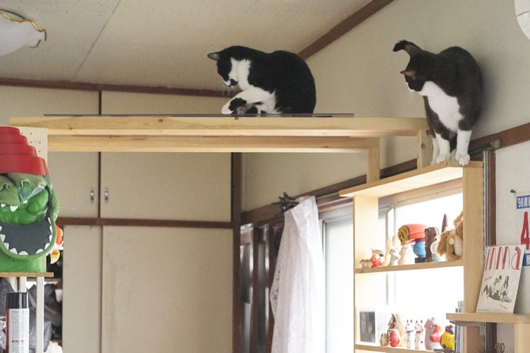ご主人がネコグッズをデザインしている倉橋というだけあって、遊びには困らないパッチとドッチ。撮影中も倉橋作の板の上に登ったり、テントの中に入ったり、ソファーの下に隠れたり、部屋の中を縦横無尽。2匹ともとても楽しそうだった。