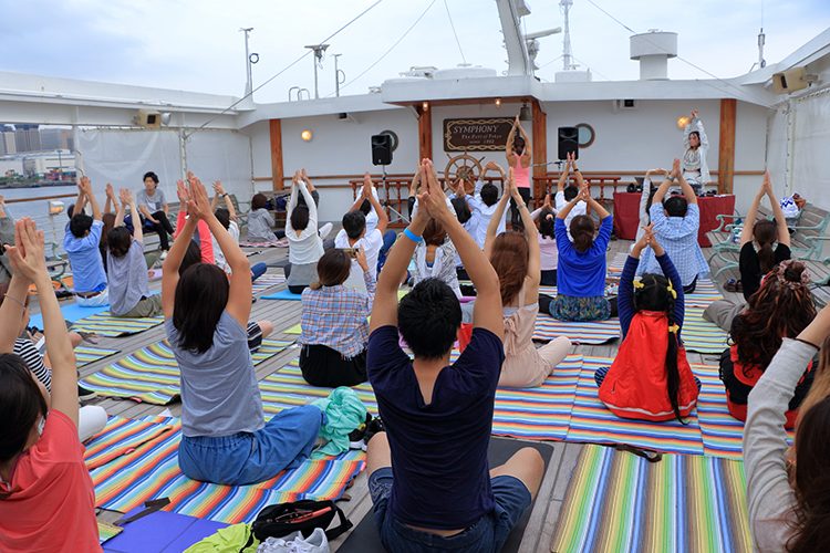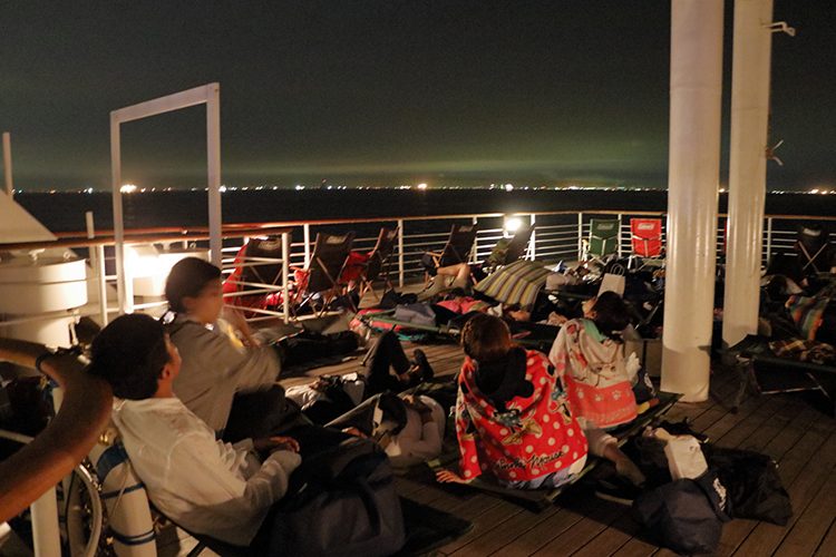 実は今年の8月で3回目となるこのイベントは、深夜に出航する客船シンフォニーのデッキにコールマンのテントやチェア、コットといったアウトドアギアを用意し、大胆にも船上ピクニックを楽しむというもの。この異色のアウトドアはジワジワとファンを増やしていて、ニッポンの夏における新たな納涼スタイルにもなりつつある。