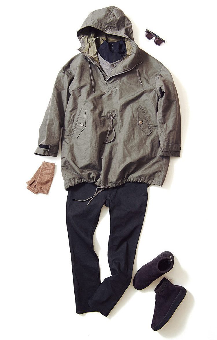 パーカ8万8000円/08サーカス(08ブック 03-5329-0801)、インナーダウン3万6000円、中に着たジャケット1万4000円/ともにサウス2 ウエスト8(ネペンテス 03-3400-7227)、パンツ2万2000円、ブーツ5万2000円/ともにノンネイティブ(ベンダー 03-6452-3072)、サングラス1万5000円/アイヴォル(アイヴァン PR 03-6450 -5300)、グローブ8000円/ジョンストンズ(リーミルズ エージェンシー 03-3473-7007)機能性を優先したいワークスタイルの相棒として