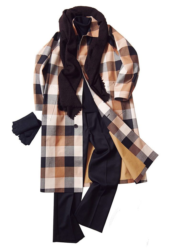 コート18万9000円/マッキントッシュ(マッキントッシュ青山店 03-6418-5711)、ニット2万5000円/スローン、マフラー3万9000円/ファリエロ サルティ、グローブ1万2500円/アンノウン(すべてユナイテッドアローズ 原宿本店 03-3479-8180)、パンツ2万8000円/ヴァイナル アーカイブ(シップス 渋谷店 03-3496-0481)、靴21万円/ジョンロブ(ジョン ロブ ジャパン 03-6267-6010)意外な着眼点からのチェック・オン・チェック
