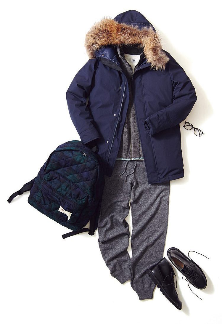 ダウンジャケット9万8000円/ピレネックス、靴1万4800円/リプロダクション オブ ファウンド(ともにユナイテッドアローズ 原宿本店 03-3479-8180)、ジャケット4万8000円/エトス(シック 03-5464-9321)、カットソー6000円/ザ・ユニオン(ザ・ブルークラス 06-4303-8900)、パンツ8万9000円/クルチアーニ(クルチアーニ 銀座店 03-3573-6059)、メガネ3万3000円/ザ・パークサイド・ルーム(ザ・パークサイド・ルーム 0422-41-8978)、バッグ1万6000円/トラディショナル ウェザーウェア(トラディショナル ウェザーウェア 青山メンズ店 03-6418-5712)コーデも時計も“骨太なのに上品”同士の組み合わせ