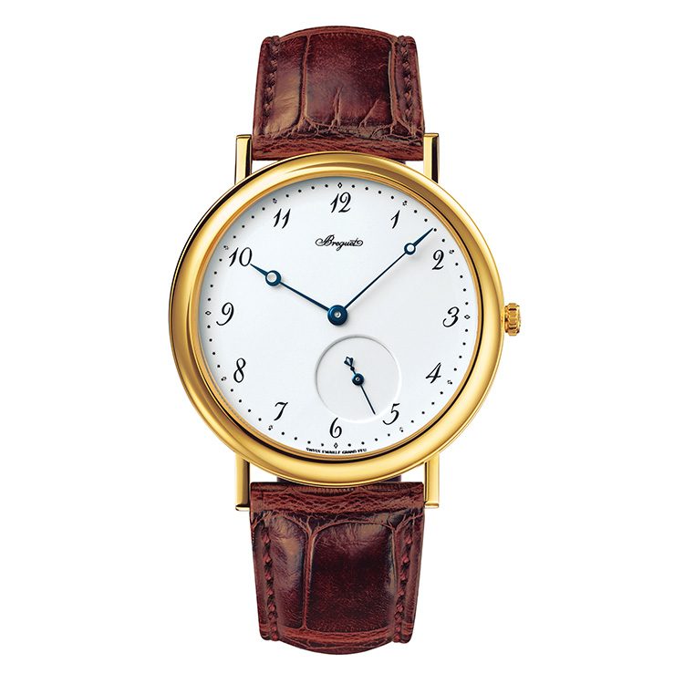 K18YGケース、40㎜径、自動巻き。203万円/ブレゲ ブティック銀座 03-6254-7211 多くを語らずとも神髄が伝わるのがブレゲの魅力。これもブレゲ数字とブレゲ針という、いずれもブランド名を冠したシンボリックなスタイルが、グラン・フー・エナメルの白文字盤に映える。その艶感を含め、美しさは経年変化することなく、いつまでも楽しめる。