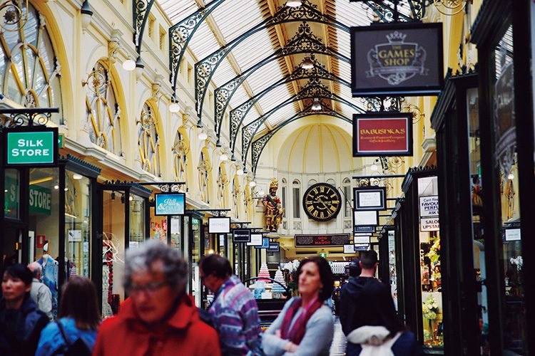 1870年にオープンしたメルボルン最古のアーケード街「ロイヤル・アーケード」。ビクトリア様式のモダンなドーム状の天井からは、心地良い光が差し込む。碁盤の目状の中心部は、1837年から始まった都市計画で開発され、東西2.4km×南北1.6kmというコンパクトな面積に街のあらゆる機能が凝縮されている。