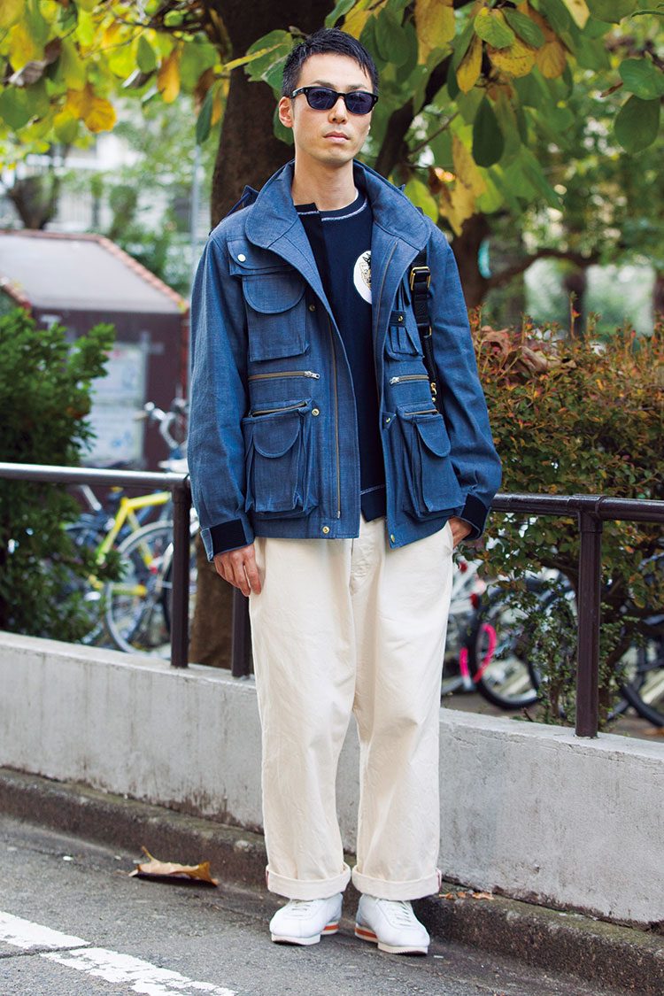 パンツ/マーカ、ジャケット/ティーエスエス、スニーカー/ヴァンズ、メガネ/オリバーピープルズ、バッグ/エンダースキーマ流行素材、コーデュロイのプリーツパンツにフリースブルゾンを。ジップの開き方で、肩からパンツへ流れるラインを作ったエキスパート術を見習いたい。そのほか、小物使い、スニーカーソールまで意識した色の拾い方など、丁寧な着こなしが光っていた。服を楽しむとは、こういうことなのだね。