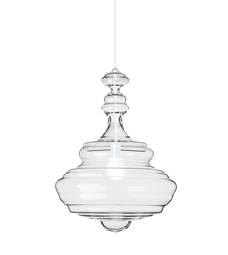 手吹きクリスタルでシャンデリアのアウトラインを象った、シンプルでありながらアバンギャルドなシェードが目を惹くライト。2007年にチェコで生まれたメーカー作。「ネバーエンディンググローリー」という作品名も優雅。