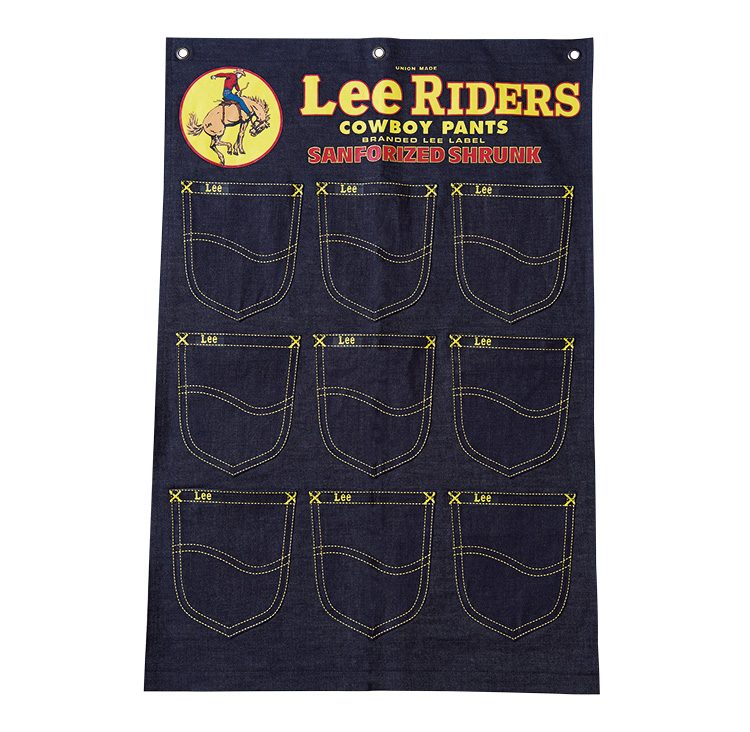 リーでは定番の左綾のデニムにジーンズのヒップポケットのデザインをプリントしたウォールポケット。古き佳き日のキャンペーンなどを思わせるデザインがクール。