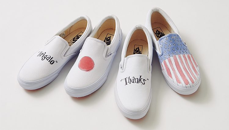 各1万1800円/フリーレイジ 075-323-7683白のキャンバスアッパーにフリーハンドでメッセージや星条旗、日の丸を描いたスリッポン。受注生産のみという特別感も物欲を刺激。