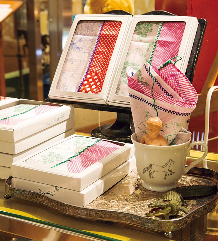 1800円/パスザバトン 表参道店 03-6447-0707製造過程で生まれたデザインの異なる端材を2枚つなぎ合わせて、新たな表情のチーフをリビルド。ステッチワークから漂う、ハンドメイド感も楽しい。