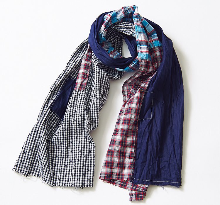 2万2000円/オー! ショールーム 03-5774-1408余剰在庫に新たな価値を与え、再び市場へと送り出す。そんなアップサイクルを生むブランド。色柄の異なるヴィンテージスカーフを1枚のストールに昇華させた。