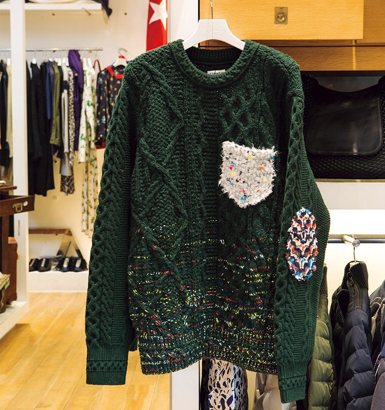3万9000円/パスザバトン 表参道店 03-6447-0707イタリアのデッドストックのウール糸を用い、創業60年を誇る山形のニットメーカーが丁寧にボディを作成。そのうえで、ポケットやエルボーパッチをショップが別注……。特別すぎる1点物ニットは、昔、彼女からもらった手編みニット以上にレアな存在かもしれない!?