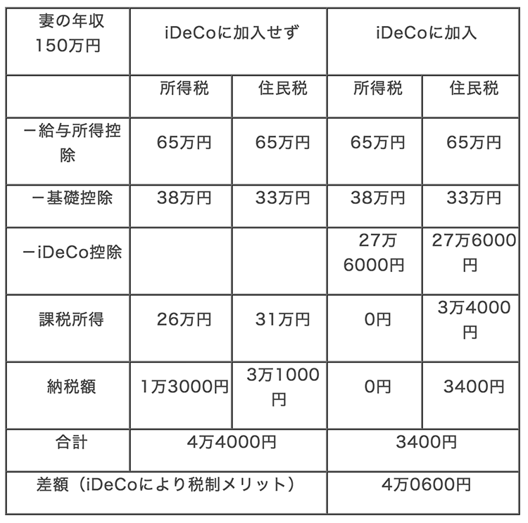 もちろん、iDeCoに加入することもお勧めです。先ほど年収150万円の税金負担は課税所得が26万円に対し所得税、住民税合わせて4万4000円とお伝えしました。もしiDeCoで月2万3000万円の積み立てをすれば、新たに27万6000円の所得控除を作ることができ、この計4万4000円の税金も、3400円と、4万0600円も圧縮できます。税率が変わらないことが前提ではありますが、30歳の妻がこの方法でiDeCoを30年継続すると、税のメリットだけでも約122万円ものおカネを節約しながら、自分年金が作れるのです。