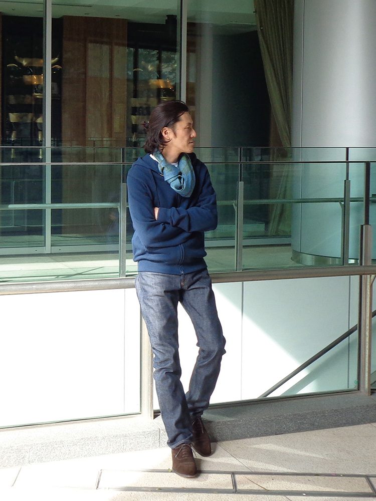 デニム1万2000円/ビューティ&ユース(ビューティ&ユース ユナイテッドアローズ 渋谷公園通り店 03-6212-1500)、パーカ2万3000円/ヤエカ 03-6426-7107、靴6万8000円/クロケット&ジョーンズ(ユナイテッドアローズ 六本木ヒルズ店 03-5772-5501)、スカーフ3万6000円/レショップ 03-5413-4714逆に地方に赴く場合などは、よりカジュアルだ。「昔から親しんでいるスケータースタイルを軸に、スエードの靴やスカーフなどの小物できちんと見えるようにバランスを取っています」。