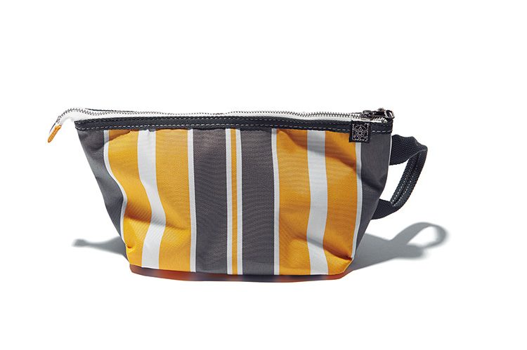 H15×W20×D9.5cm 2900円/ヤマニ 03-3862-0821リゾートライクなストライプ柄のポーチは、テントやパラソルなどに使われる耐久・撥水性に優れたポリエステルキャンバスを使ったもの。リラックスムードを湛える外見にしてその“中身”はタフネスそのもの。こうしたギャップにもつい心が動く。