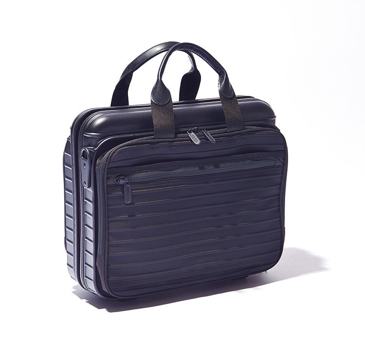 H33×W39×D15cm 4万5000円/リモワ 072-994-5522マットブラックのブリーフケース「ボレロ ノートブック」はお馴染みのポリカーボネートボディとケプロテック製フロントポケットからなる。特に後者は防弾チョッキにも使われるケブラー繊維を使っていると聞けば、その堅牢性へのこだわりがわかるはず。