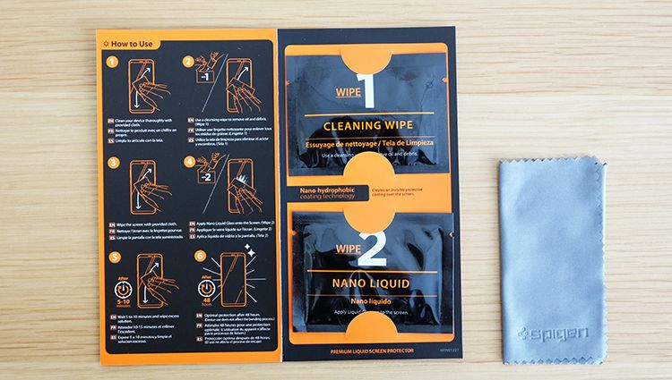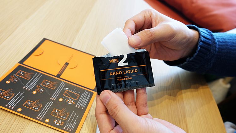 手順は非常に簡単。付属のクロスで画面を拭いてゴミやホコリを取ったら、WIPE1(クリーニング用ウェットクロス)、WIPE2(ナノリキッドスクリーンクロス)の順に拭いていくだけ。