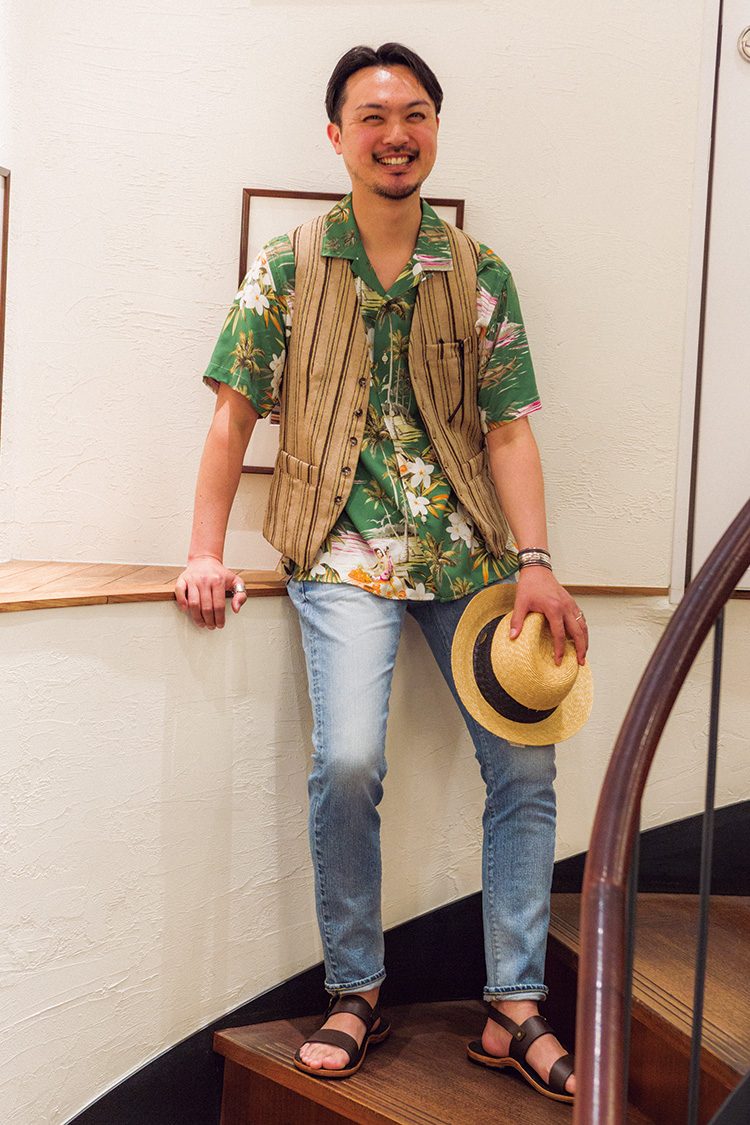 「アロハシャツとデニムを合わせる際には、アメカジ然としたカジュアルになりすぎないように気をつけています。例えば、パンツはスリムテーパードでスッキリ見せつつ、ベストをレイヤードして大人っぽさを演出します」。