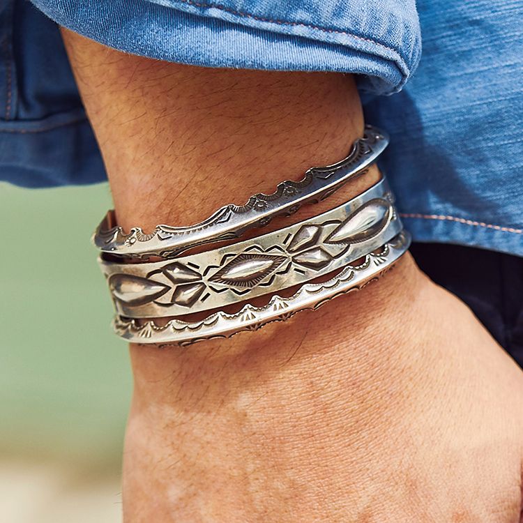 サイズ&デザイン違いのバングルを重ね漬け。ネイティブジュエリーで「ちょうどいい装飾具合」のものを探しているアナタ、ぜひ参考に。