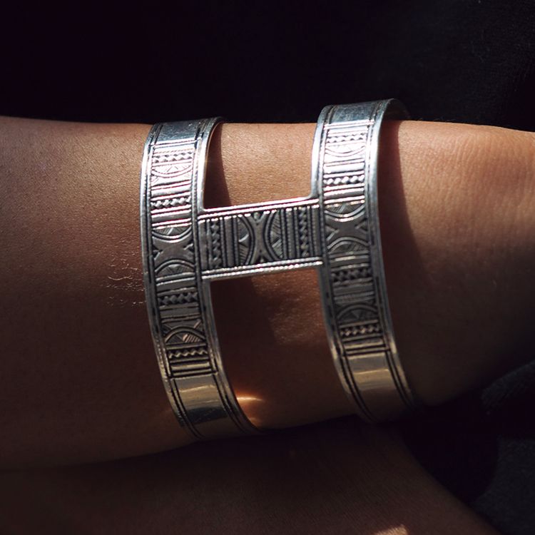 エルメスがリリースするシルバージュエリーの中でも、稀少といわれる「トゥアレグ」シリーズのバングル。カジュアルスタイルをリッチに仕上げる最高のタレントである。