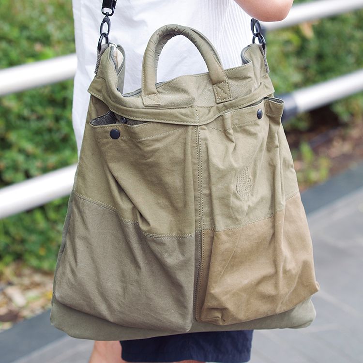 軍用ヘルメットバッグを元ネタにした大型バッグ。実用的であるとともに、コーディネイトを男クサく見せてくれるアクセサリー的側面も。