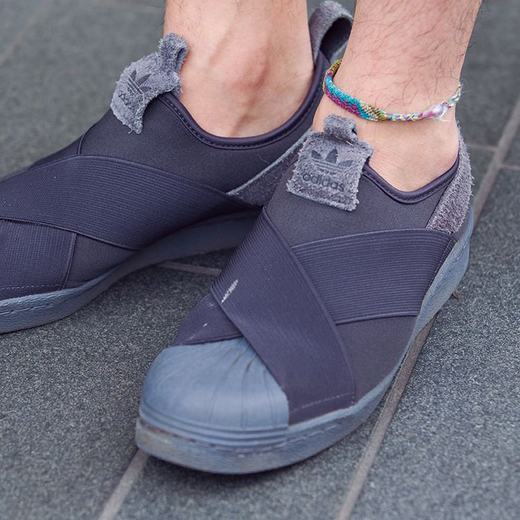 スマッシュヒットとなった、特徴的なシェル型のトウデザインを採用した「SS スリッポン」を素足に。真っ黒ではなく、グレーを選ぶあたりがセンスの良さ、なのですね。