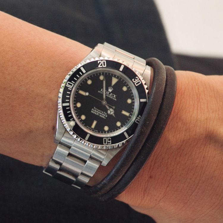 スポーツウォッチの「サブマリーナー」のノンデイトタイプ。ずっと飽きずに、どんなスタイルにもハマるいい時計を1本持っていると、コーディネイトを締めたいときに役立つ。