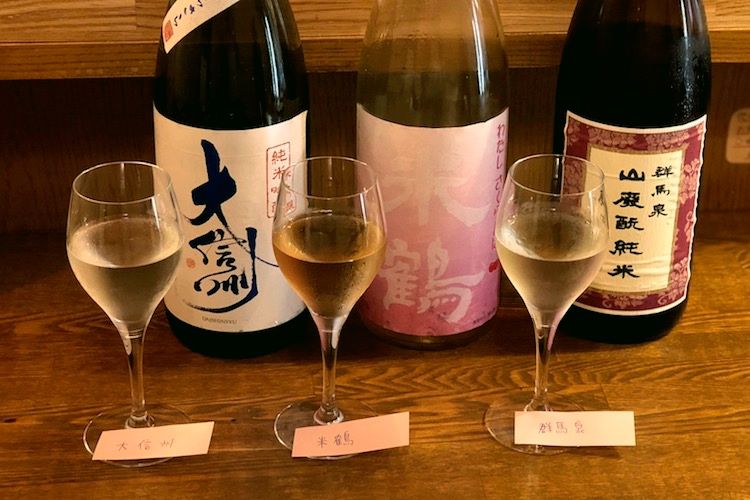 写真左から「大信州」、「米鶴」、「群馬泉」。「『大信州』は夏限定の清涼系、『米鶴』はさくらんぼを思わせる甘酸っぱさが特徴、『群馬泉』は私の地元のお酒で昔ながらの濃厚な味わいです」。