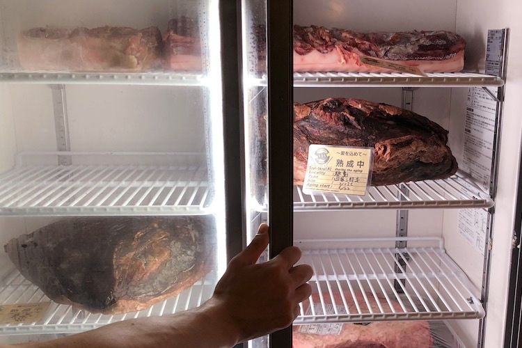 入り口横の熟成庫の中で静かに眠る肉たち。美味しい日本酒をチビチビと飲んでいるところへ、あづささんが再び登場。
