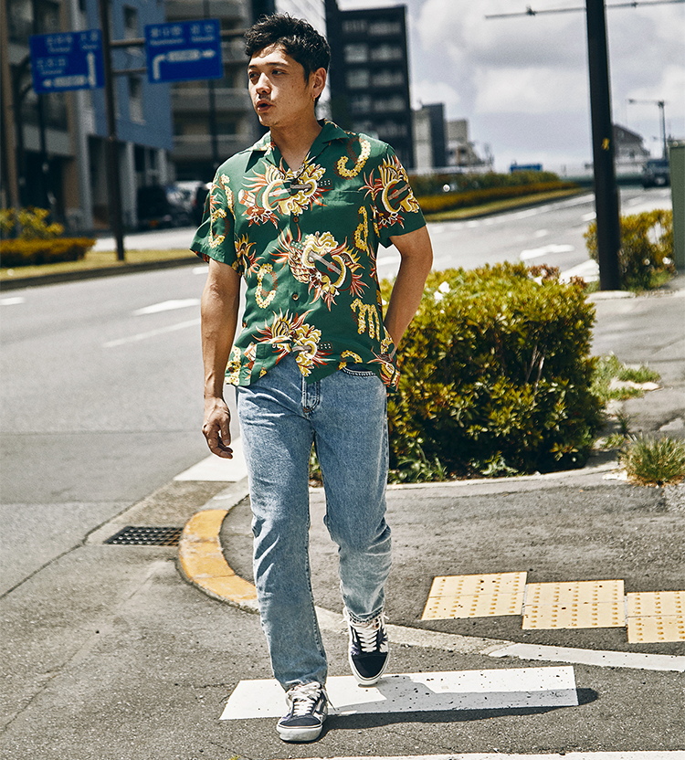 「レーヨンのテロっとしたアロハシャツは、リアルな古着デニムと合わせると野暮ったさが増幅するのですが、このデニムならズバリ! 若々しさがあるから、少々おじさんっぽいトップスでも乗りこなせちゃうんですね」