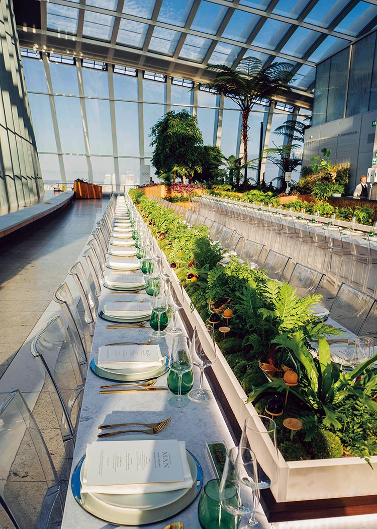 ロンドン市内を一望できるスカイガーデンにて。この演出に世界中から集まったゲストは大満足。サプライズ上手な、ちょっとした遊び心を持つことも、男には必要なのだ。