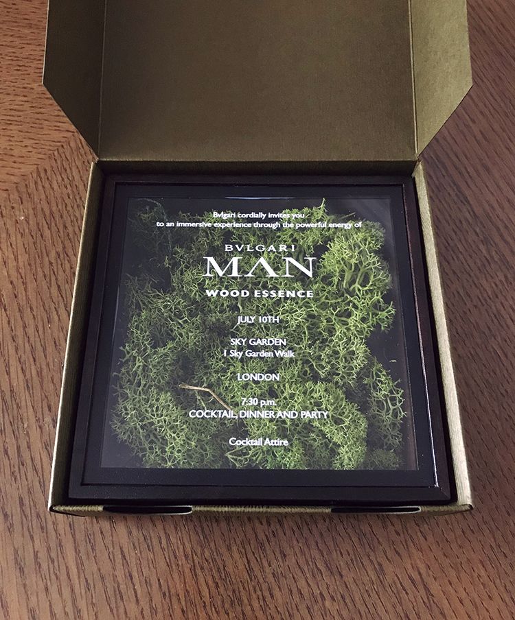 シダーウッドを封入したボックス型のインビテーション。会場は、地上155mからロンドン市内を一望できる「スカイガーデン」。香りの世界観を見事に表現した空間で、フルコースのディナーにバータイム、クラブラウンジまで優雅な一夜を提供した。