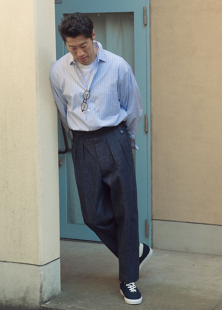デニム3万5000円/ニート(にしのや 03-6452-6934)、シャツ1万9000円/エイチ ビューティ&ユース 03-6438-5230、Tシャツ6000円/サタデーズ ニューヨーク シティ 03-5459-5033、スニーカー4万5000円/ソロヴィエール(ユナイテッドアローズ 六本木ヒルズ店 03-5772-5501)、胸に掛けたメガネ3万円/アヤメ 03-6455-1103ラストは腰元に配置された左右2本のインプリーツが特徴的。’40年代のイギリス軍のオフィサーパンツが元ネタになっているという。楽しみ方は三者三様、個性を見せるのか隠すのか。はきたくて、ウズウズしてこない?