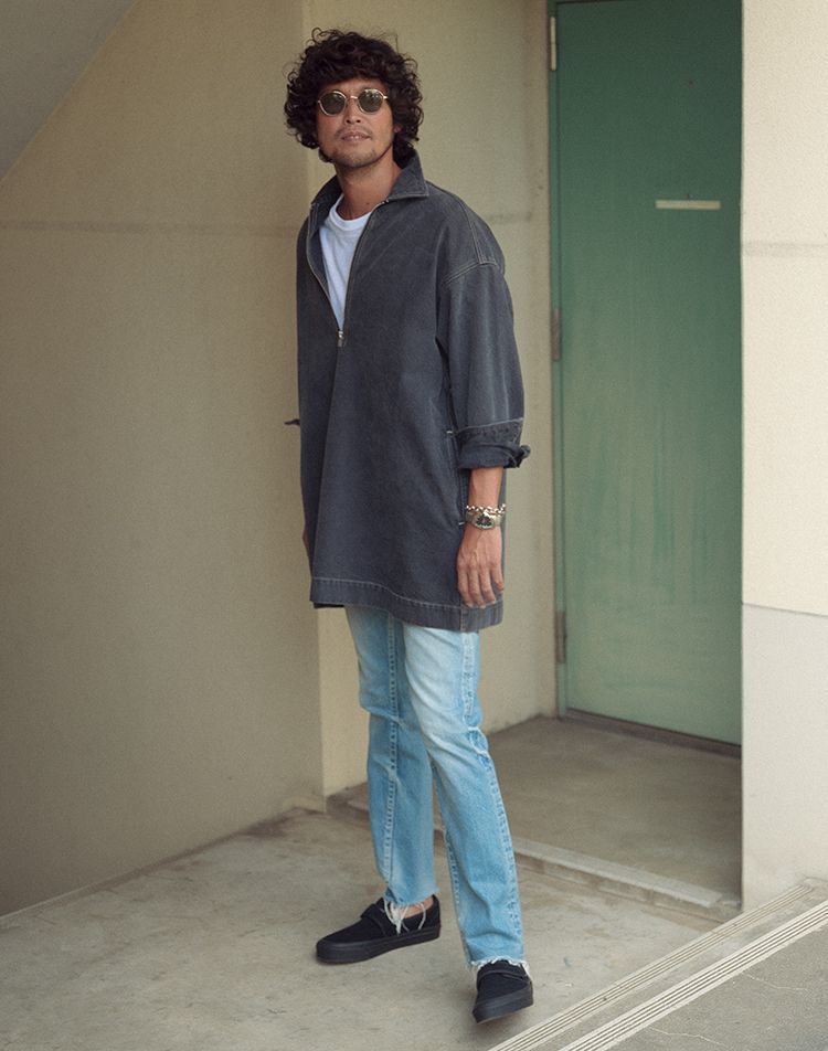 ジャケット3万8000円/N.ハリウッド(ミスターハリウッド 03-5414-5071)、Tシャツ5800円/ウィンダンシー(レイク・タホ 03-5708-5757)、デニム3万6000円/マイシンクス(RHC ロンハーマン 045-319-6700)、スニーカー1万円/ヴァンズ(ビリーズ エンター 渋谷店 03-5466-2432)、サングラス4万円/アヤメ 03-6455-1103、ブレスレット5万9000円/ノンネイティブ×エンド(ベンダー 03-6452-3072)、腕時計9万1000円/ハミルトン(スウォッチ グループ ジャパン 03-6254-7371)例えば、デニム・オン・デニムだって、上はブラックで下はブルーの一見チグハグな組み合わせも、自由に楽しめばいい。なんていいながら……オーバーサイズトップスにタイトボトムスでバランスを取ってみたり、上下のフェイド感を揃えてみるなど、細かな微調整があるっていうのはここだけの話。