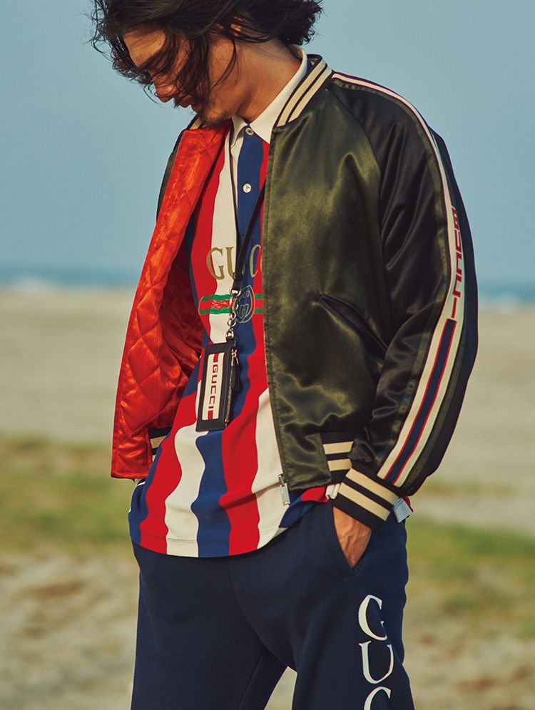 ブルゾン28万5000円、ポロシャツ7万2000円、パンツ9万8000円、首から下げたカードケース5万2000円/すべてグッチ(グッチ ジャパン 0120-88-1921)’80年代のヴィンテージ プリントからインスピレーションを得たロゴを筆頭に、街を席巻するロゴブームの火付け役はグッチといって異論はないだろう。ブルゾンの袖、インナーのフロント、パンツのサイド…… すべてに異なるロゴを配したワードローブで組んだスタイリング。先駆けだけに許される存在感が、そこにはある。