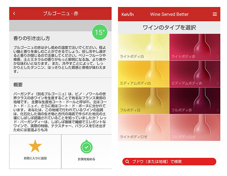装着したワインのラベルに書かれている産地やブドウの品種といった情報を参照し、該当する項目を検索&選択すれば、自動的に温度の計測がスタートする。