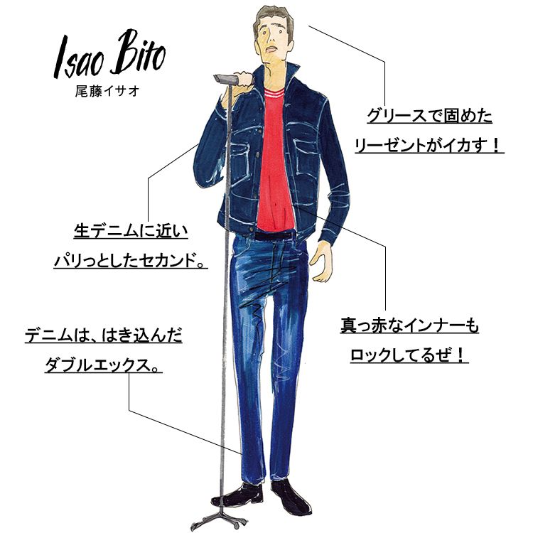 彼が着ていたのは、リーバイスのセカンドのGジャンとデニム(おそらくダブルエックス)のセットアップ。おそらく、ヴィンテージデニムでステージに上がった最初の日本人だろう。「あしたのジョー」で「るるるるー♪」と歌う前の尾藤さんは、音も装いも最高にロック!そんなヴィンテージデニムの“粋”も取り入れたい。