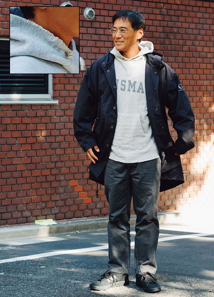 ストーリーのある洋服は確かにそれだけで気分を高めてくれるが、「しかもサイズバランス、コルク製のドローコードなど細部のディテールもすべて好みだった」という。軍パンにデニムに、シンプルコーデでパーカを主役使いした迷いのないスタイルからも“ひと目惚れ”が伝わってくる。