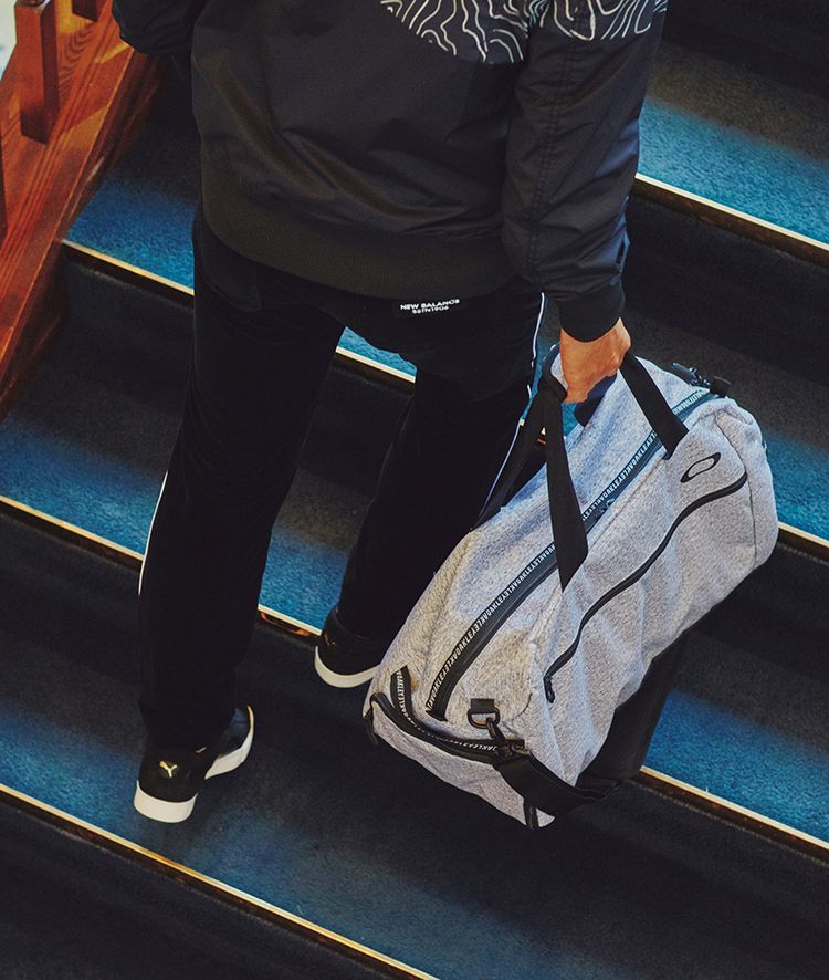 H30×W50×D24cm バッグ9000円/オークリー(ミラリ ジャパン 0120-009-146)、ブルゾン1万8000円、パンツ2万円/ともにニューバランス(TSIグルーヴアンドスポーツ ニューバランス ゴルフ 事業部 03-6748-0702)、シューズ1万3000円/プーマゴルフ(プーマ 0120-125-150)シンプルな構造ながら、シューズ用の収納ポケットも付属する軽量ボストンバッグ。ジップ回りのロゴテープがデザインのポイントになっている。ゴルフからジム通いまで対応してくれる、頼れる相棒バッグだ。