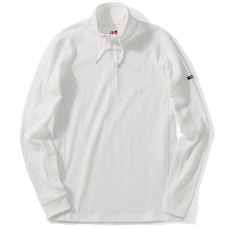 1万3000円/マスターバニーエディション 03-6748-0392ゴルフの定番インナーといえばポロシャツ、あるいはシャツ。ただ今季ちょっと目につくのは、ご覧のようなモックタートル風の、ドローコード付きプルオーバーだ。首元の防寒と装いのアクセント、その両方に効くディテールといえる。