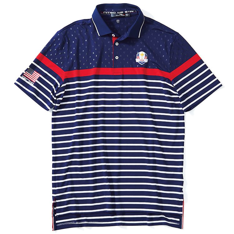 1万7000円/アール エル エックス ラルフ ローレン(ラルフ ローレン 0120-3274-20)9月末に開催された、欧州ツアーと米国ツアーの代表による対抗戦「ライダーカップ」。そのアメリカチームのオフィシャルポロがこちら。星条旗をイメージした“強そう”なデザインで、優れた透湿性と、スイングを邪魔しないストレッチ性を備えた逸品だ。