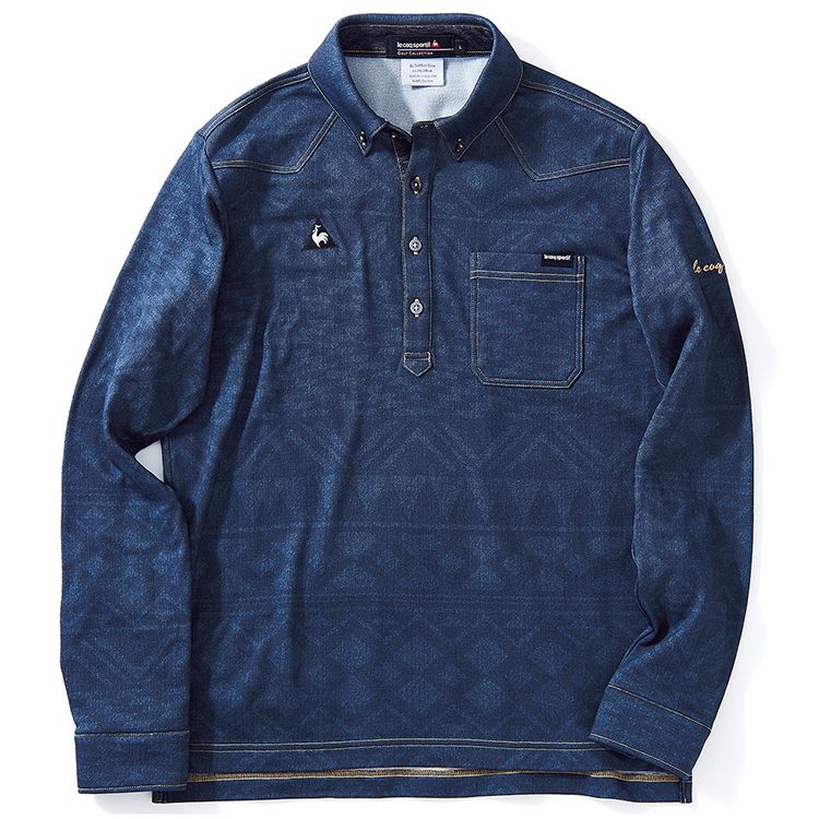 1万2000円/ルコック ゴルフ(デサントジャパン 0120-46-0310)ゴルフ場のドレスコードもずいぶん緩和されてきた昨今。それでもデニムシャツの着用は難しいのでは? いや、このシャツはデニムではなく、デニム風の高機能素材を用いたもの。保温性に優れた「ヒートナビ」の糸を使用した1着なのであった。