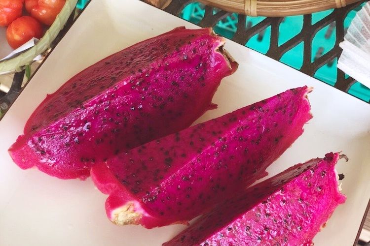 初めて食べたドラゴンフルーツに看板娘、感動。「あんまり感動したので、そのおばあちゃんと記念写真を撮りました」