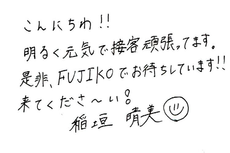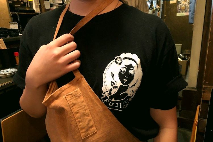 Tシャツのイラストは山内さんが「FUJIKO」をイメージして作ったもの。そんな晴美さんだが、働き始めてすぐの頃に痛恨のミスを犯したという。