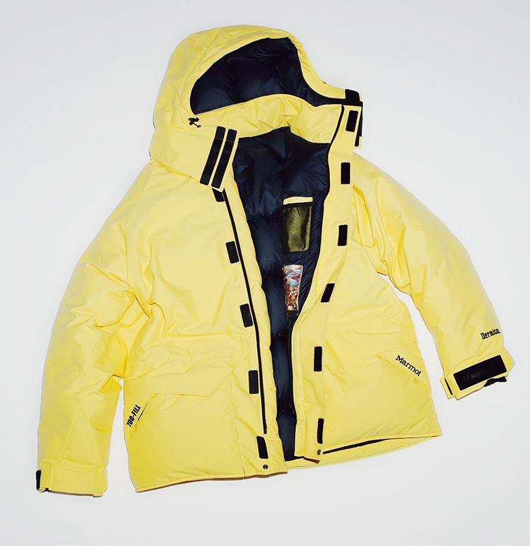 1974年の創業以来、多くの登山家をサポートしてきたマーモットとタッグを組んだのは、時代とスタイルをミックスさせたら右に出る者はいないドメスティックブランド、ヴァイナル アーカイブ。ドロップショルダーで身幅が広く、着丈が短めの可愛らしいシルエットのダウンは、最強に今っぽい。