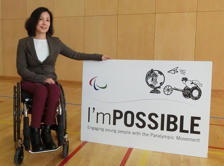マセソン美季さん。「I’mPOSSIBLE」のパネルと一緒に(筆者撮影)「できないと考えるのではなく、やり方や考え方を少し変えるだけで可能になるというのは、パラリンピアンもオリンピアンも一緒ではないでしょうか」。