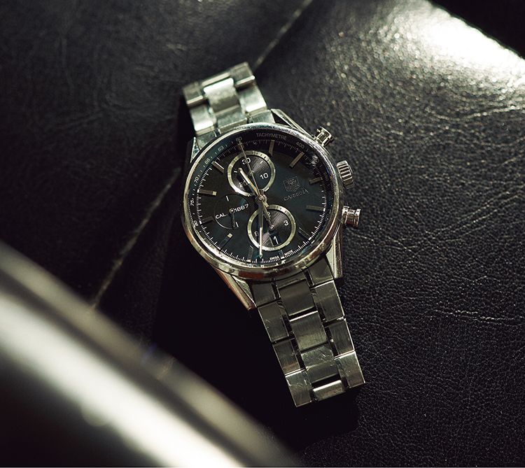 「欲しかった時計でした。雑誌をスクラップしていたくらい。彼女もそれに気付いていたみたいで。モノトーンスタイルが好きな僕のために、黒文字盤のタグ・ホイヤー カレラを選んでくれました」。休日はもっぱら4歳になる娘との“デート”が楽しみという斉藤さん。その腕元にはいつも、結婚指輪のように2人を結ぶこの時計がある。
