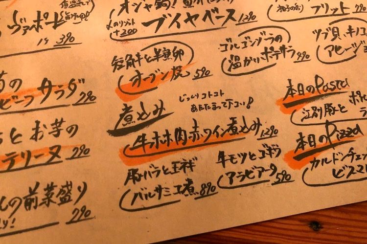 すごいことになった。淡路島の玉ねぎの炭火焼(390円)、ピッツァマルゲリータ(990円)、牛ホホ肉赤ワイン煮込み(1290円)。どれも素晴らしかったが、とくにとろっとろの牛ホホ肉の濃厚ソースに感動。